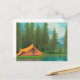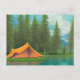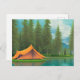 Keeping in touch postcard with a camping theme with beautiful AI art with a big tent on the lake with pine trees and mountains in the background.
