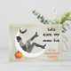 A spooky frankenstein mama, complete with knee high black leather boots, rests against a silver crescent moon on the front of this campy, humourous Halloween party invitation. A black bat flies over, and a glowing orange jack o lantern sits at the bottom. The text, in black and orange, says Let's Kick up some fun at our Halloween Party! The back of the invitation holds your customized party text among three black bats. Fun!