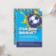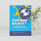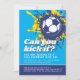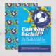Can you kick it? Football soccer ball kids sports party invitations in bright blue, yellow, white and dark blue. Personalize with your own party details. Colourful soccer ball going into the back of the net graphic art and design by www.mylittleeden.com on dazzle.
