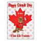 Fun Canadian design features a wavy red waves and Maple leaf background. Cute beaver in a Mountie Hat is waving a Canadian Flag. Text says... Happy Canada Day from The Eh Team on the front. Inside text is ready for you to customize.