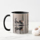 This mug features six migrating Canada Geese sitting on a log in a shallow pond. Their brown, black and white markings are reflected in the water. The water ripples create a fascinating vertical pattern of reflected tree trunks.