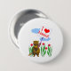 Button with my design of a beaver holding a sign that says "I heart Nunavut" with a red heart and flowers.
