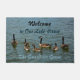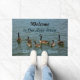 Canadian Geese, a gander, a goose and their goslings, on lake water with your personalized greeting, Lake, lakefront cabin or lake house name and your Family Name all customizable on this photographic Welcome doormat. Canadian Geese mate for life and in this photography the two larger parents are seen with their young brood of smaller goslings. The distinctive colouring of the Canadian Geese with their black head and neck, white cheeks, white under its chin, brown body, white bottom and black tail is on display against the blues and green of the lake's water in this beautiful wildlife family portrait. This is original bird photography of Lake Norman in North Carolina, USA by JLW_PHOTOGRAPHY.