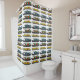 The perfect narrowboat bathroom shower curtain printed with rows of colourful yellow, green, red and blue hand drawn canal boats