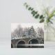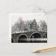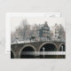 Photo postcard of a canal with a bridge, traditional houses and bikes under some snow in winter in the Dutch capital city, Amsterdam, the Netherlands with a fading white bar and the text 'Amsterdam'.