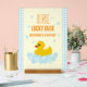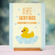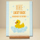 Un canard chanceux ! Premier anniversaire avec canard en caoutchouc et bulles contre un en vichy bleu clair et arrière - plan jaune pâle avec texte orange