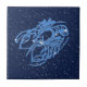 Tile in the zodiac symbol for Cancer in soft silver blue, overlaid with the stars of the constellation, against a starry sky background in deep midnight blue