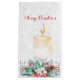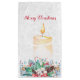 Festive red bow, a watercolor yellow candle, holly berries, fir twigs, and white flowers over white snowflakes background