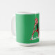 Festive holiday coffee mug features candy cane striped letter A with added holly and customizable text to add name or monogram on green background.
