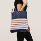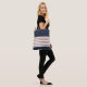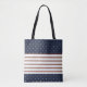 A basic striped pattern with a polka dot accents. This all-over-print-tote features a bold red line with thinner green line, on either side. This combination alternates with a hairline black rule and a thick white band. At the top and bottom of this design there's a block of navy, with gold coloured dots. The design is on both sides.