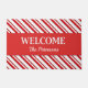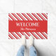 Doormat in diagonal candy cane stripes of deep candy cane red and white, with personalized text