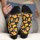 Fun Halloween themed socks patterned with colourful candy corn sweets on black