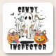 This image is a Halloween-themed design featuring a ghost in the centre, with the words "CANDY INSPECTOR" written in bold black letters below. The ghost is depicted with a friendly, cartoonish expression and is surrounded by various candy-themed elements, including lollipops, candy canes, and candy corn. On either side of the ghost are two jack-o-lanterns, each with a different expression. The jack-o-lanterns are filled with colourful candy, adding to the festive and playful atmosphere of the design. The background is transparent. Overall, the image is a whimsical and cheerful representation of the Halloween holiday, with a focus on the sweet treats that are often associated with the occasion.