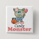 A cute candy monster with a candy bow waving a lollipop demanding a treat while holding out a trick or treat pumpkin with chocolate and candy overflowing from it. This monster is more cute than spooky or scary wearing a light blue t shirt that says Treat Me. A cute Chrissy H. Studios original Halloween design on shirts, apparel and more merchandise.