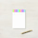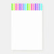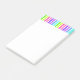 This note pad has a colourful vertical striped border on the top edge with different shades of pink, purple blue and green, alternating with white.