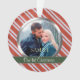 This holiday keepsake ornament features your own photograph within a pretty red and white Christmas candy stripe pattern frame which has an inside silver lining. A green banner holds your customized text; make it say whatever you'd like! The other side has the same stripe border with additional text on the white interior. An elegant keepsake gift for newlyweds or any couple.