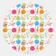 An envelope seal sticker featuring a candy pattern consisting of lollipops, gumballs, cupcakes, and stick candy.  Look for matching items at Jill's Paperie.