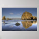 Cannon Beach Haystack Rock Low Tide in Oregon Coast along Pacific Ocean with Blue Sky Reflection Poster