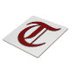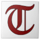 The letter T in Canterbury style done in red on a white background with a slight shadow to give it a three dimensional effect.
