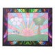 A digital stained-glass design in the Art Deco style popular in the 20th century. The widely-used sunburst motif is central, rising behind a green landscape balanced by a tree on one side and clouds and flowers on the other. Geometric shapes are used to emphasize the symmetry of the scene, with both the tree and clouds made of overlapping circles. Various brightly coloured fractals give the "glass" texture and interest. The scene is framed in black ironwork and diamond-shaped blocks frosted with dark but vivid fractal patterns.