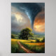 As the tranquil emerald meadow breathes beneath a cerulean canvas, nature's fury awakens. Behold, a titanic tempest dances upon the horizon, an artist's rendition of chaos and calm entwined. A colossal tornado emerges, a swirling masterpiece of awe and dread, while the meadow's serenity stands poised for a dance with destiny.