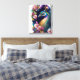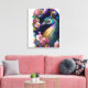 This stretched canvas wall art is shown with a art print of a colourful peacock.