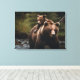 This stretched canvas wall art is shown with a photo print of a mama bear and cub in the river.