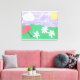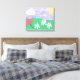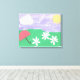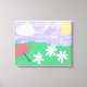 This nature scene on wrapped canvas includes green grass, daisies, sunshine, and a lavender sky.