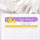 Un adorable canard jaune et canard dans un bain savonneux blanc bulle sur un arrière - plan violet clair avec un ruban orange et des rayures jaunes. Graphiques par PrettyGrafik