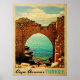 A vintage-look travel design featuring Cape Anamur Turkey. blue ocean and sky with stone ruins.