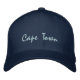 Fits well due to elastic edging, not adjustable. Good qualty material. Good quality embroidering. Subtle lettering (white on beige) just as my wife likes.