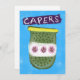 A cute and colourful jar of capers over a blue textured background with flower accents and handdrawn text.