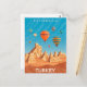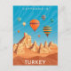 This cool design features a travel poster of the ancient cliff homes of Cappadocia Turkey with colourful hot air balloons flying high in the sky.