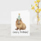 This birthday card features a watercolor portrait of a capybara wearing a birthday hat with the caption "Cappy Birthday".