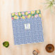 Design with a background pattern based on a vintage blue and white tile pattern and overlaid with handpainted watercolor lemons and pink flowers.