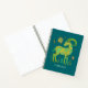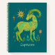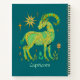 Journal in a stylized depiction of a goat, intricately decorated with patterns of green and yellow, representing the zodiac sign Capricorn. Surrounding elements include celestial symbols and leafy designs.