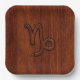 A Capricorn zodiac symbol in brown mahogany wood grain style print background. A modern urban racy design for a great custom birthday gift idea.