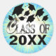 Voici quelques stickers de graduation ronds amusants et uniques populaires et enveloppes avec un design graphique en argent "Classe de" cool sur un arrière - plan d'éclatement de soleil bleu et blanc et beaucoup de casquettes de graduation en noir avec des tasselles d'or joyeusement voler au-dessus pour célébrer le grand jour! Ajoutez facilement l'année à customiser. Des autocollants parfaits pour les enfants, les ados, les hommes et les femmes diplômés de n'importe quel âge et toute la classe de graduation!
