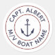 Personalized captain with your name and boat name nautical anchor logo round stickers. Classic round emblem with navy blue anchor. text and maroon boarders on a white background.