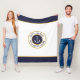 Personalized captain with your name and boat name nautical anchor logo fleece blanket. Classic circle emblem with anchor and text fields in navy blue, white and gold on a white background.