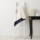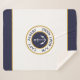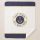 Personalized captain with your name and boat name nautical anchor logo sherpa blanket. Classic circle emblem with anchor and text fields in navy blue, white and gold on a white background.