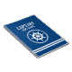 Captain's Log nautical notebook with custom name. Personalized office supplies with maritime theme. Add your own name or monogram. Vintage typography template with ship wheel and rope logo. Navy blue and white or custom background colour. Cool gift idea for sailor, skipper, fisher, boat captain, sailing friend, dad, father, uncle, grandpa, wife etc. Create your own log book, diary, journal, note book, agenda etc. Sailing and boating themed gifts for him and her. Handy for writing down memories and more.