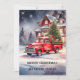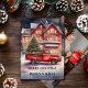 This card invites you into a watercolor winter wonderland where nostalgia meets festivity. At the forefront, a vintage red pickup truck steals the show, adorned with a grand Christmas tree in its bed. The scene unfolds before a warmly lit house, casting a cozy, inviting glow. The snowy landscape beneath and the majestic forest trees in the background are rendered with meticulous detail, creating an idyllic holiday tableau.