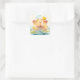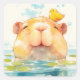 A charming and playful illustration of a capybara peacefully floating in water with a small yellow bird perched on its head. The capybara's expression is calm and content, with its snout slightly raised above the surface. Surrounding it are lily pads and gentle ripples, creating a serene aquatic setting. The background consists of soft blue skies with fluffy clouds, enhancing the tranquil atmosphere. The watercolor-like effect gives the image a whimsical and soothing feel, making it perfect for animal lovers and nature enthusiasts.