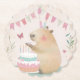 This whimsical illustration features a cheerful capybara celebrating a birthday in style. The capybara, adorned with a playful party hat topped with candles, joyfully holds a slice of cake. The scene is completed with a beautifully decorated two-tiered birthday cake, featuring pastel hues of pink, blue, and white, topped with vibrant candles. The festive backdrop includes pink and blue butterflies, floral patterns, and a string of colourful pennant banners, adding to the joyous ambiance. Perfect for birthday celebrations, party invitations, or themed merchandise, this charming design exudes fun and festivity.