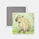 A tiny watercolor painting of a Capybara sitting amongst blue flowers in the spring.