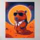 Funny modern wall poster with a capybara on planet mars wearing a suit and sunglasses with the sun at the back. Unique home decor with a printed or digital download printable option.