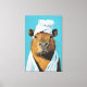 A charming and whimsical portrait of a capybara, the world’s largest rodent, dressed in a spa-like attire. The animal is draped in a white towel with another wrapped around its head, set against a soothing blue background. The capybara’s calm and serene expression gives the impression that it’s enjoying a moment of relaxation, adding a touch of humour and warmth to the scene. The detailed brushwork highlights the capybara’s fur and the soft texture of the towels, making this artwork a delightful and lighthearted piece.