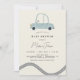 Car baby shower invitation in a minimalist style with a baby blue car and cars pattern on back. You can personalize this invitation with your own details under the "Personalize this template" section.