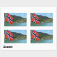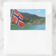 Rectangular photo sticker with the Norwegian flag on a car ferry between Solvorn and Urnes on a fjord in Norway.